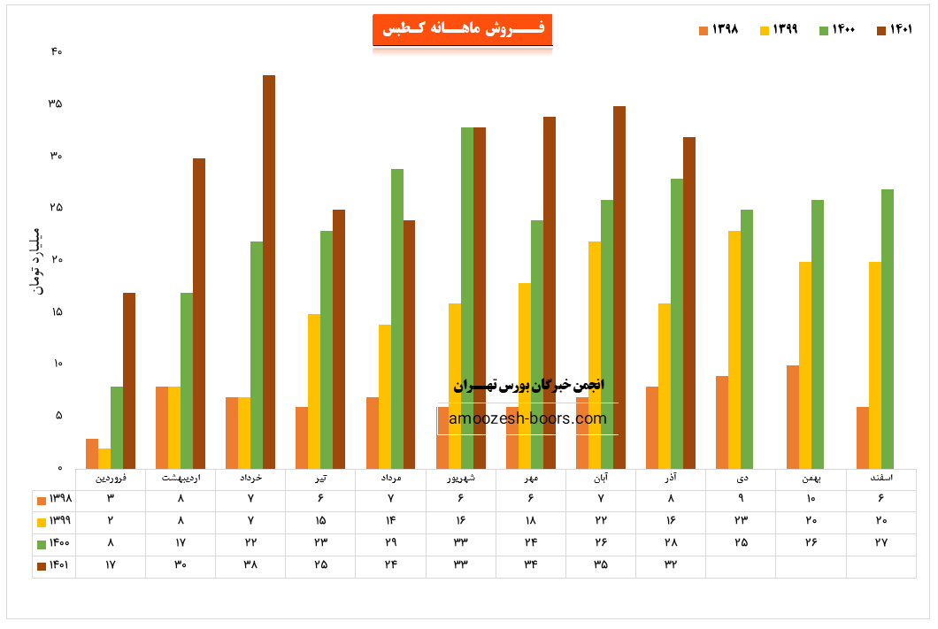 مجموع درآمد سهم کطبس طی عملکرد 10 ماهه نسبت به مدت مشابه 30% افزایش داشته و با توجه پیش بینی فروش 371 میلیارد تومانی حدود 83% آن محقق شده است.