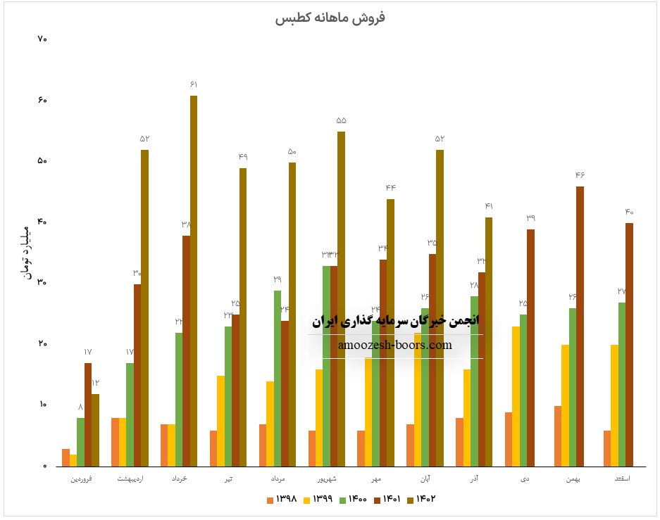 درآمد آبان ماه سال 1402 سهم کطبس 51.5 میلیارد تومان بوده است که در مقایسه با ماه گذشته 17% رشد داشته است.