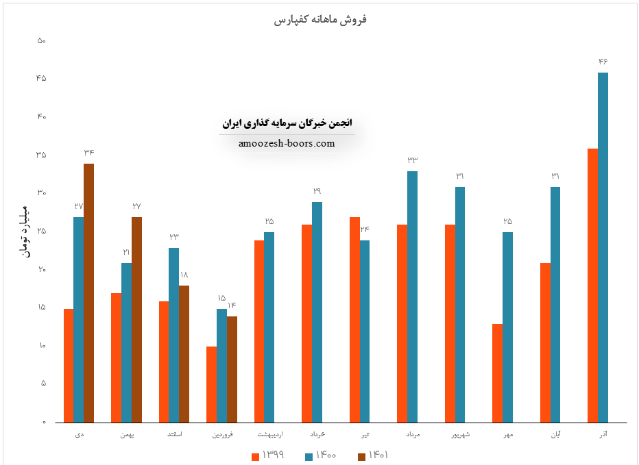 نماد کفپارس سال مالی متفاوت و منتهی به آذر ماه دارد و در سومین ماه از سال مالی درآمدی معادل با 17 میلیارد و 800 میلیون تومان را محقق نموده است، این درآمد تماما از طریق فروش داخلی تامین شده، آجر منیزیت اسپینل محصول اصلی شرکت فرآورده های نسوز پارس میباشد که مقدار فروش این محصول نسبت به ماه گذشته با افت 41 درصدی همراه بوده و نرخ فروش آن بدون تغییر خاصی نسبت به ماه قبل گزارش شده است، مجموع عملکرد 3 ماهه سهم کفپارس 11% رشد نسبت به مدت مشابه داشته است.