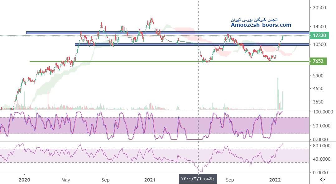 در حال حاضر قیمت در منطقه مقاومتی پرتراکم، با پتانسیل ایجاد واگرایی منفی و قرار گیری اوسیلاتور در منطقه اشباع خرید قرار داشته . با توجه به افزایش حجم چشمگیر معاملات ، در صورت ایجاد نشانه های اصلاح قیمت ، پیشنهاد به سیو سود میگردد، همچنین در صورت شکست مقاومت 15000 ریال تا تست قله تاریخی قیمت بر سر راه سهم قرار دارد .