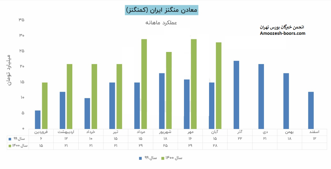شرکت معادن منگنز ایران با نماد کمنگنز در بهمن ماه ۱۴۰۰ مبلغ ۳۲ میلیارد تومان درآمد داشته که این میزان در مقایسه با ماه گذشته ۱۶ % افت و همچنین در مقایسه با مدت مشابه سال گذشته ۸۸ % رشد درآمد پیدا کرده است.