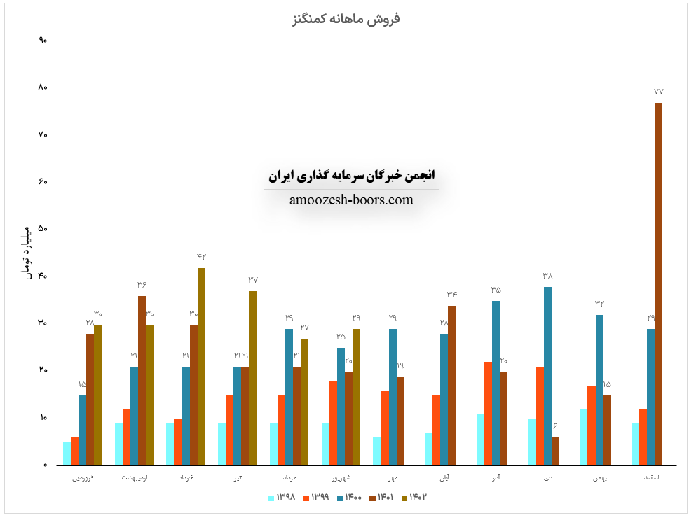 فروش آذر ماه سال 1402 سهم کمنگنز 59.9 میلیارد تومان گزارش شده است، تغییرات درآمدی کمنگنز به شرح زیر میباشد: