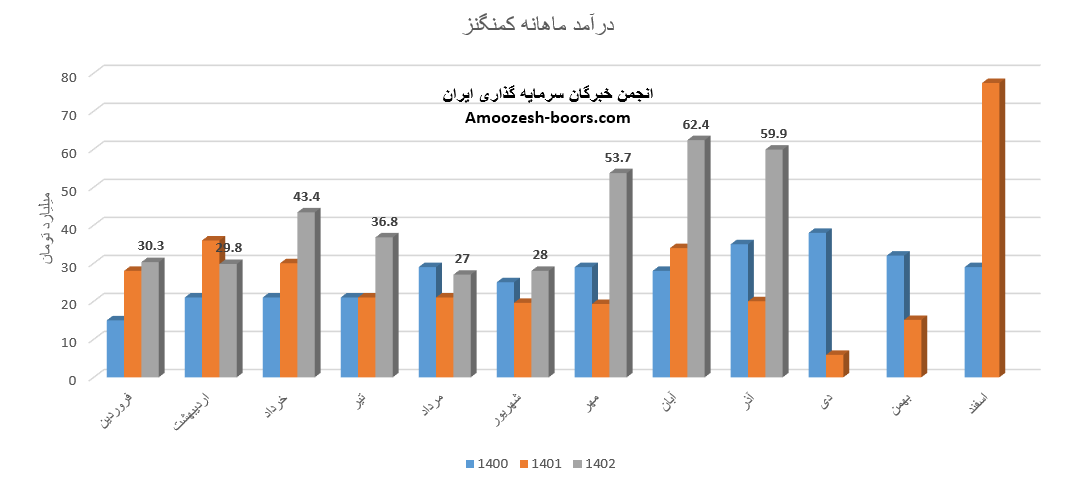 درآمد آبان ماه سال 1402 سهم کمنگنز 62.4 میلیارد تومان بوده است که در مقایسه با ماه گذشته 16% رشد داشته است.