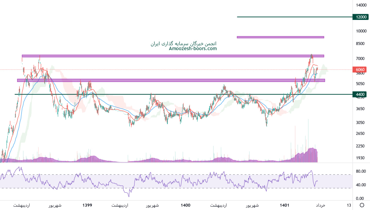 نماد کهمدا مادامی که بالای محدوده حمایتی 5000 ریال معامله شود در روند صعودی قرار دارد، در حال حاضر مقاومت سهم کهمدا محدوده 7000 ریال ارزیابی میگردد که در صورت عبور قیمت از این ناحیه محدوده های 9000 و 12000 ریال به ترتیب مقاومت های بعدی این نماد خواهند بود، همچنین حمایت بعدی کهمدا 4400 ریال در نظر گرفته خواهد شد.