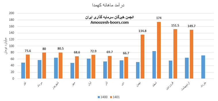 درآمد ماهانه نماد کهمدا با انجام 36% فروش صادراتی به مبلغ 148.2 میلیارد تومان رسیده است، باید درنظر داشت سال مالی سهم کهمدا متفاوت از همگروهیان بوده و طی مدت 12 ماهه بهبود 77 درصدی درآمد نسبت به سال گذشته را تجربه نموده است، درآمد سهم کهمدا در آخرین ماه از سال مالی افت درصدی نسبت به ماه گذشته و رشد 109 درصدی نسبت به مدت مشابه داشته است.
