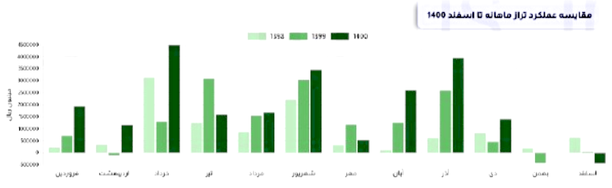 شرکت در این دوره تراز منفی 44.4 میلیارد تومان (11-%) را ثبت کرده است. تراز شرکت در این دوره نسبت به میانگین ماه های قبل 119% کاهش داشته است. شرکت نسبت به دوره 1 مشابه سال قبل 1264% کاهش تراز داشته است.