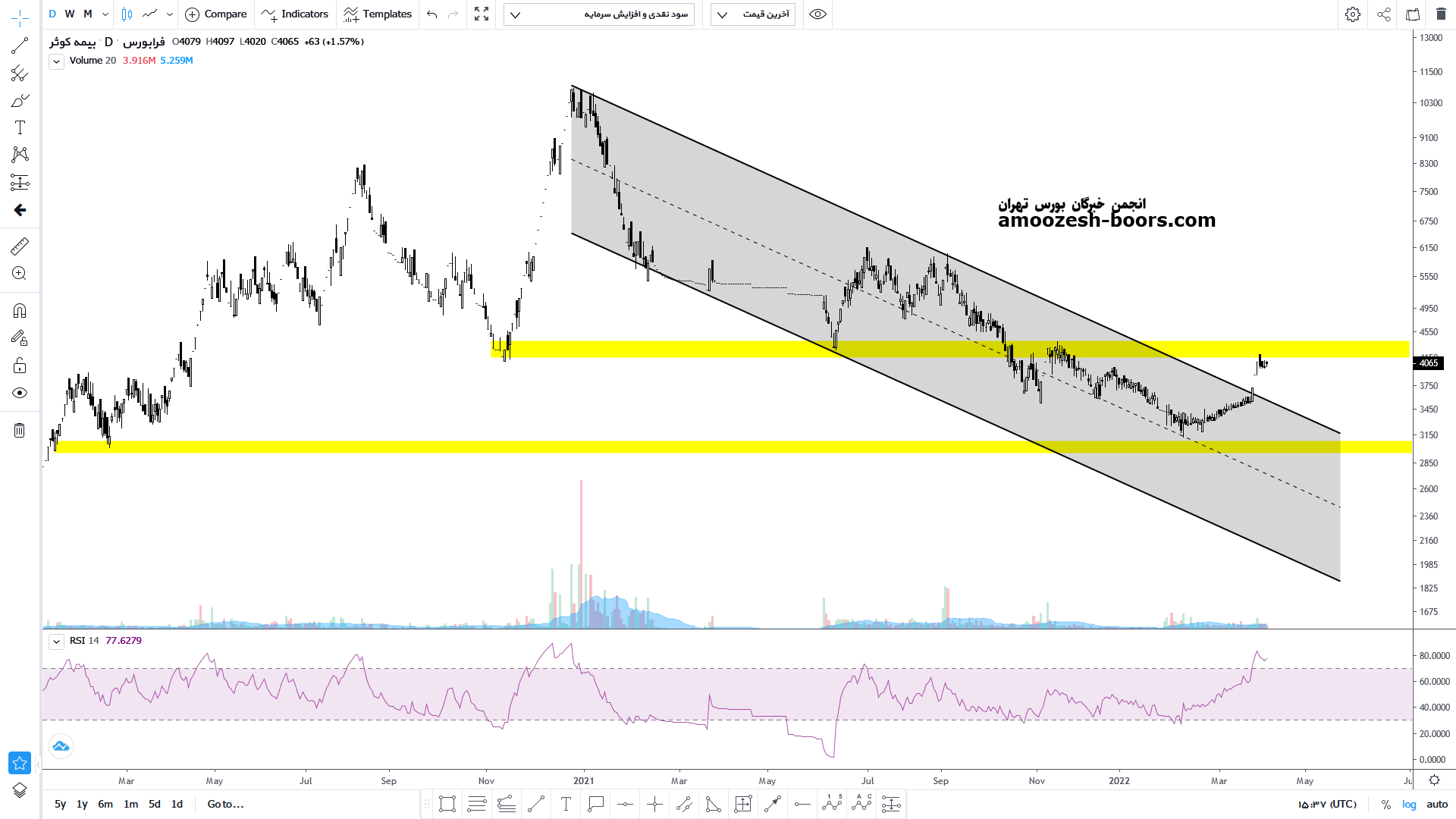 قیمت پس از حدود ۳۰ % رشد از محدوده میانی کانال توانسته با شکست سقف کانال نزولی خود و و سپس با برخورد به محدوده مقاومتی محدوده ۴۳۰ تومان به نظر در حال تشکیل پولبک به کانال شکسته شده میباشد که در صورت تایید این پول برگ می تواند رشد خود را تا مقاومت محدوده ۴۳۰ تومان و سپس در صورت شکست تا مقاومت محدوده ۶۰۰ تومان نیز ادامه دهد اما در صورت عدم تایید پول برگ و برگشت مجدد به درون کانال قیمت می تواند محدوده حمایتی ۳۱۰ تومان را نیز تست کند.