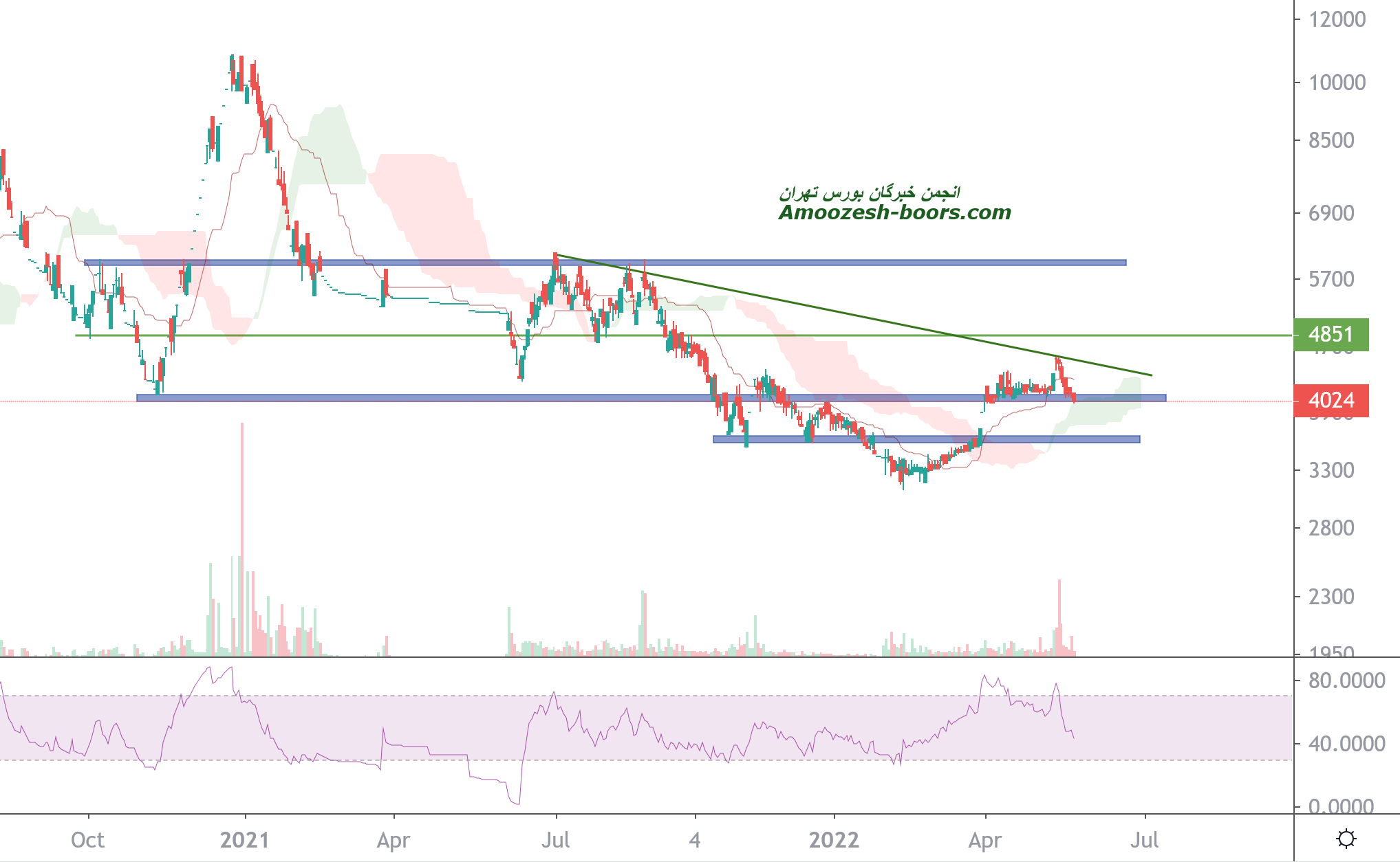 قیمت بعد از برخورد به مقاومت خط داینامیک نزولی شروع به اصلاح کرده و در حال حاضر به محدوده حمایتی پر تراکم استاتیک و عدد رند و روانی 4000 ریال رسیده در صورت ادامه دار شدن حجم عرضه و شکست پر قدرت این محدوده حمایتی نزول قیمت تا حمایت استاتیک در محدوده قمتی 3500 ریال محتمل خواهد بود و همچنین در صورت تثبیت قیمت اولین و دومین مقاومت سهم به ترتیب 4500 و 4800 ریال در نظر گرفته خواهد شد.