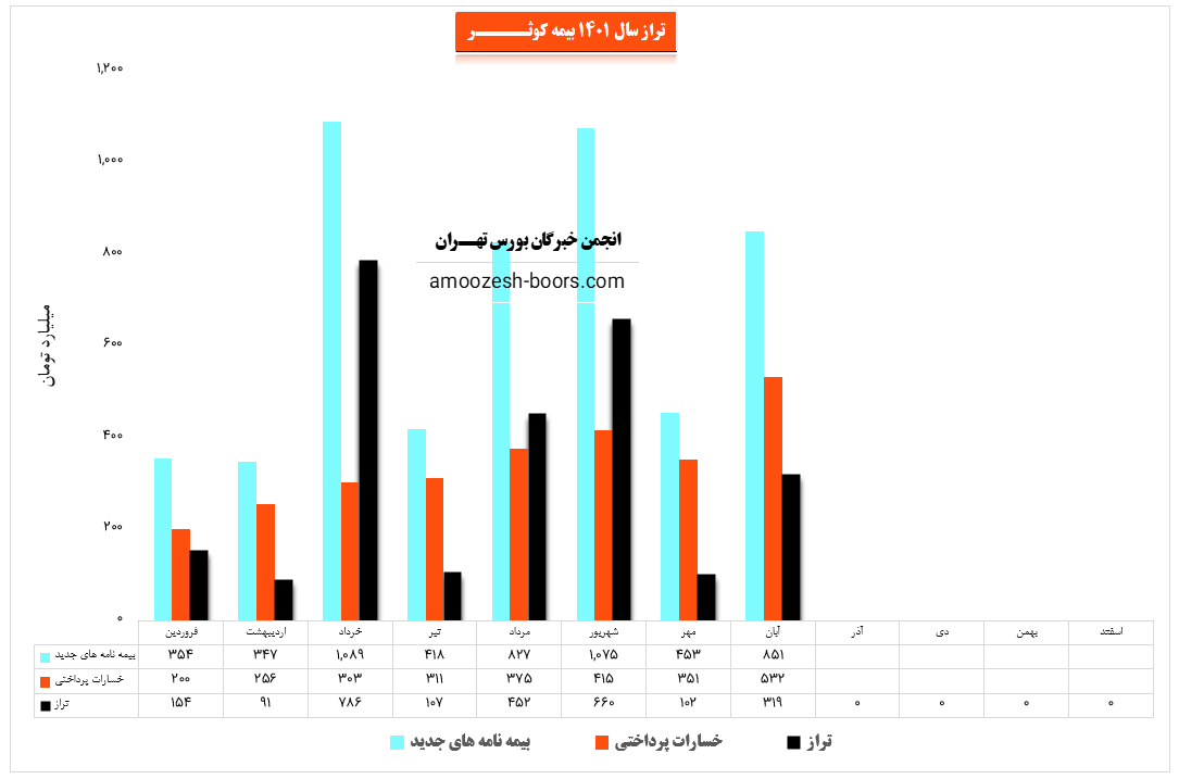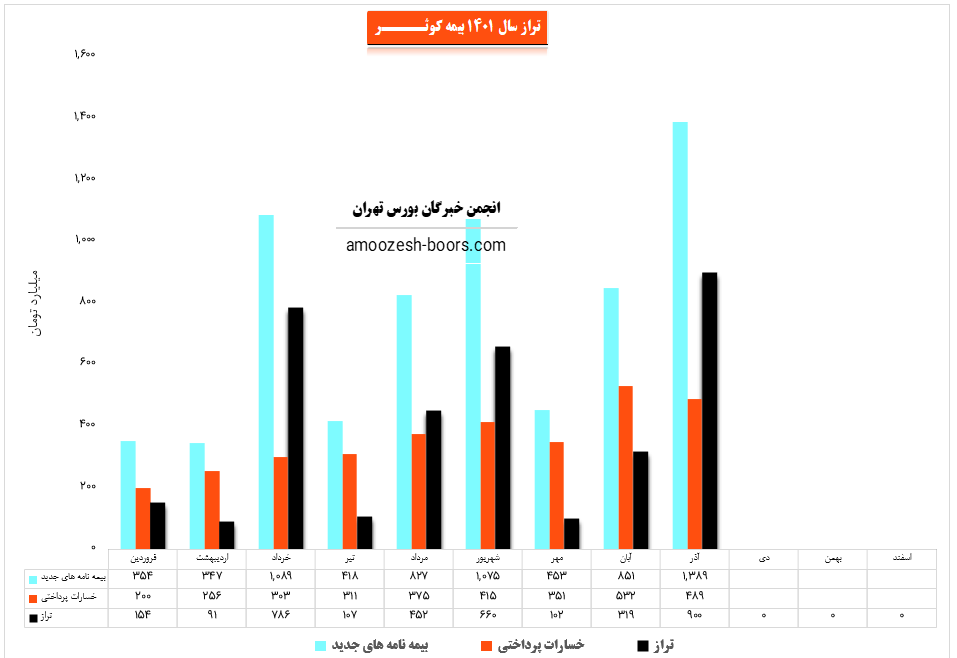 نماد کوثر (شرکت بیمه کوثر) در آبان ماه سال 1401 حدود مبلغ 851 میلیارد تومان بیمه نامه جدید صادر کرده که این میزان در مقایسه با ماه گذشته 88% افزایش پیدا کرده است.