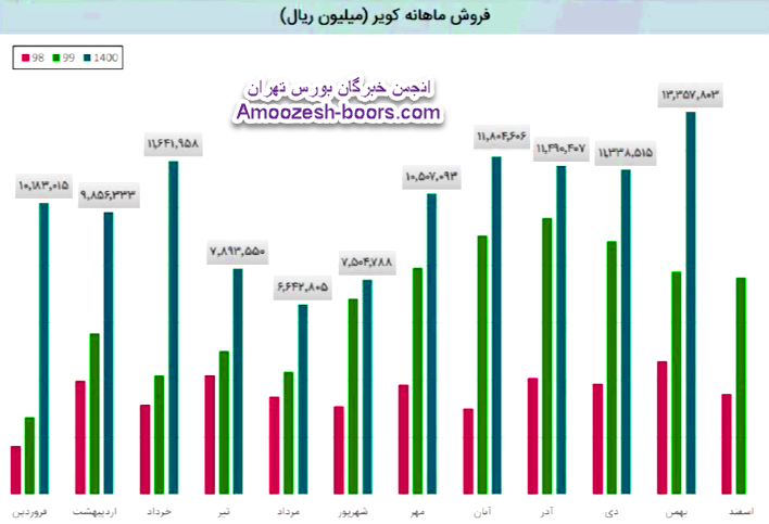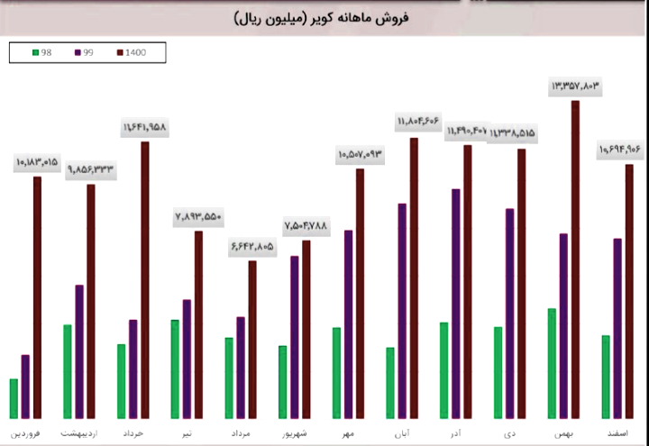 شرکت تولیدی فولاد سپید فراب کویر طی عملکرد 1 ماهه منتهی به 1401/01/31 معادل 7,480,561 میلیون ریال از محصولات خود را به فروش رسانده است که نسبت به دوره 1 ماهه مشابه سال قبل 27% کاهش داشته است.هچنین نسبت به ماه قبل کاهش 30 درصدی و نسبت به میانگین ماه های گذشته کاهش 27 درصدی نشان می دهد. فروش فروردین امسال نسبت به سال قبل 27 درصد افت کرده است. کویر در این ماه 20930660 کیلوگرم انواع میلگرد شاخه و کلاف را به فروش (داخلی) رساند که کاهش 33 درصدی نسبت به ماه گذشته نشان می دهد همچنین نرخ فروش این محصول نسبت به ماه قبل افزایش 13 درصدی داشته است.