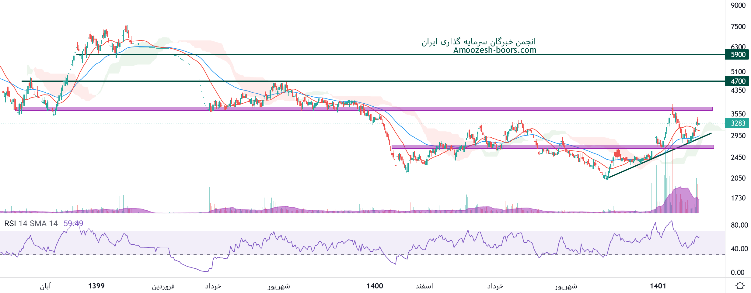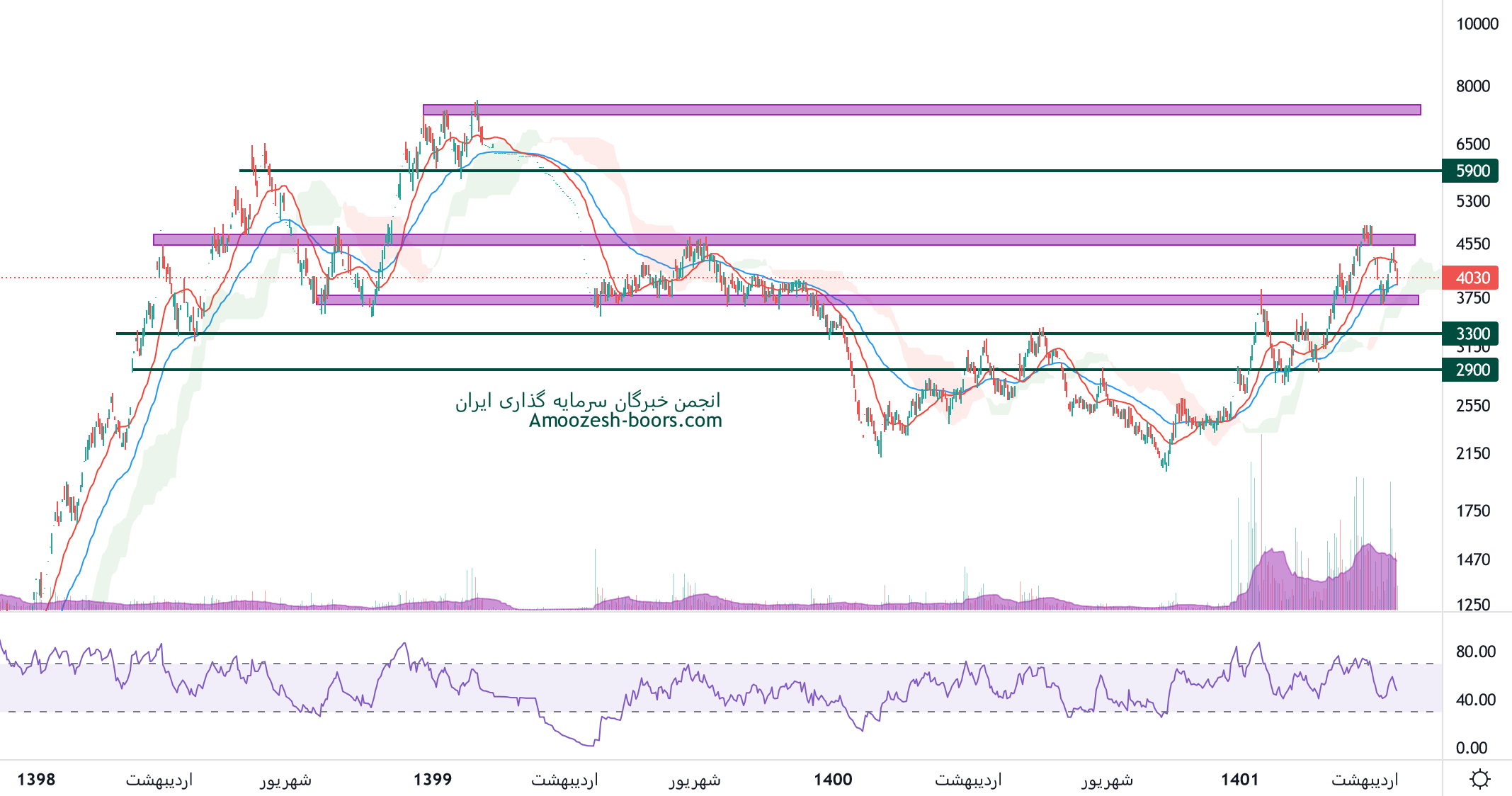 نماد کویر مابین محدوده حمایتی 3700 ریال و محدوده مقاومتی 4700 ریال قرار دارد، در صورت از دست رفتن محدوده حمایتی اصلاح تا 3300 ریال محتمل خواهد بود، همچنین در صورت عبور قیمت از مقاومت کویر، مقاومت بعدی 5900 ریال در نظر گرفته خواهد شد.