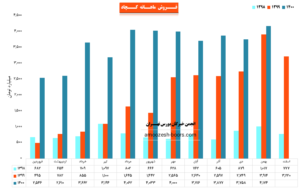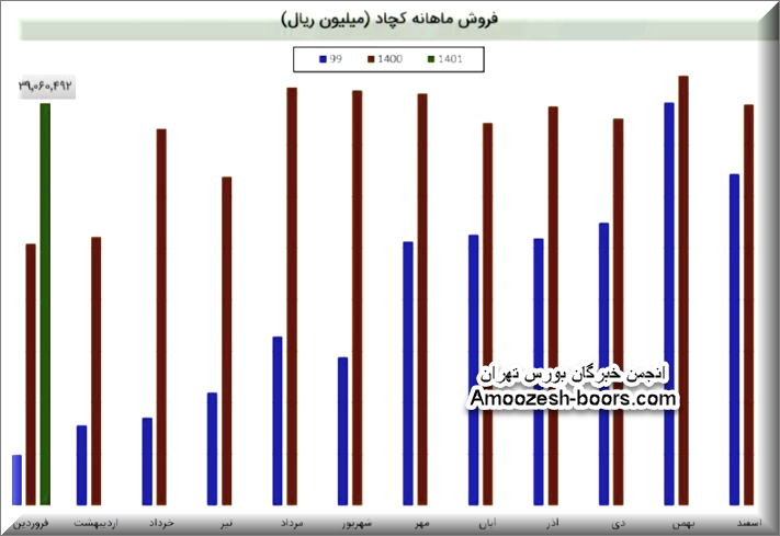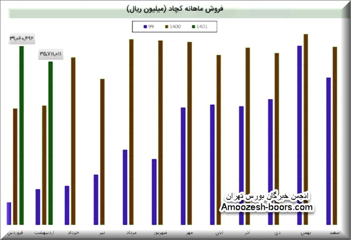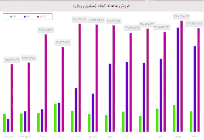 کچاد در فروردین به فروش 39060 میلیارد ریالی رسیده است (90%) درصد از درآمد شرکت درین ماه مربوط به فروش داخلی و (10%) درصد آن مربوط به کل صادرات شرکت است. شرکت نسبت به دوره 1 ماهه مشابه سال قبل 53% افزایش درآمد داشته است.درآمد شرکت مشابه سال قبل و نسبت به میانگین ماه های گذشته افزایش 3% را نشان می دهد.