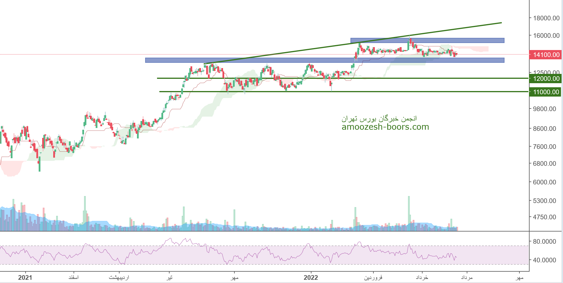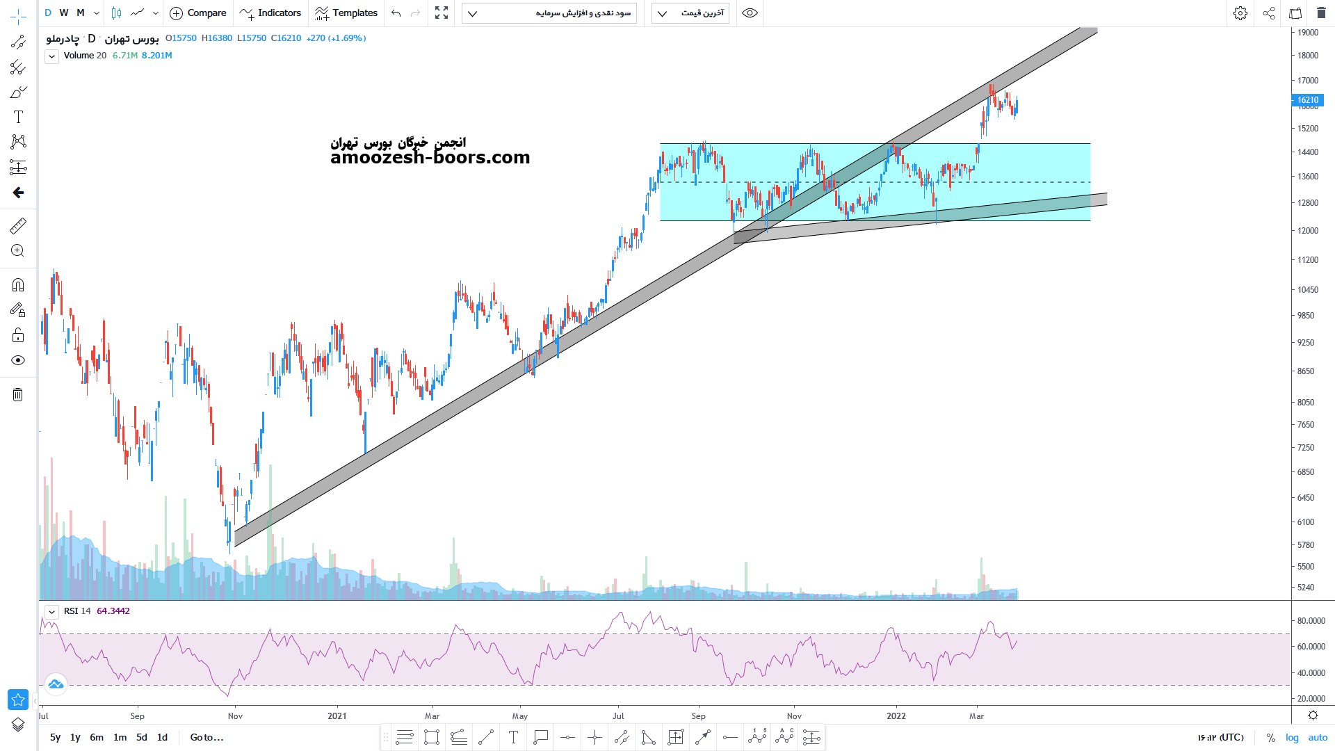 قیمت پس از شکست کانال خنثی رشدی را تا محدوده مقاومتی داینامیکی خود تجربه کرده است اما نتوانسته از سد این مقاومت عبور کند با بروز واکنش منفی اصلاح کوتاهمدتی را آغاز کرده است اکنون محدوده حمایتی ۱۴۵۰ الی ۱۵۰۰ تومان را پیش روی خود دارد که در صورت حمایت می تواند مجددا مقاومت داینامیکی خود را تست کند اما در صورت شکست این محدوده حمایتی می تواند اصلاح خود را تا محدوده ۱۲۰۰ تومان ادامه دهد