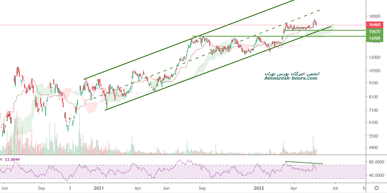 سهم با افزایش حجم معاملات و واگرایی منفی در حال تکمیل موج اصلاحی خود میباشد در صورت تثبیت در حمایت 15500 کف کانال به ترتیب مقاومت های 16800 و 17600 بر سر راه سهم قرار دارد .