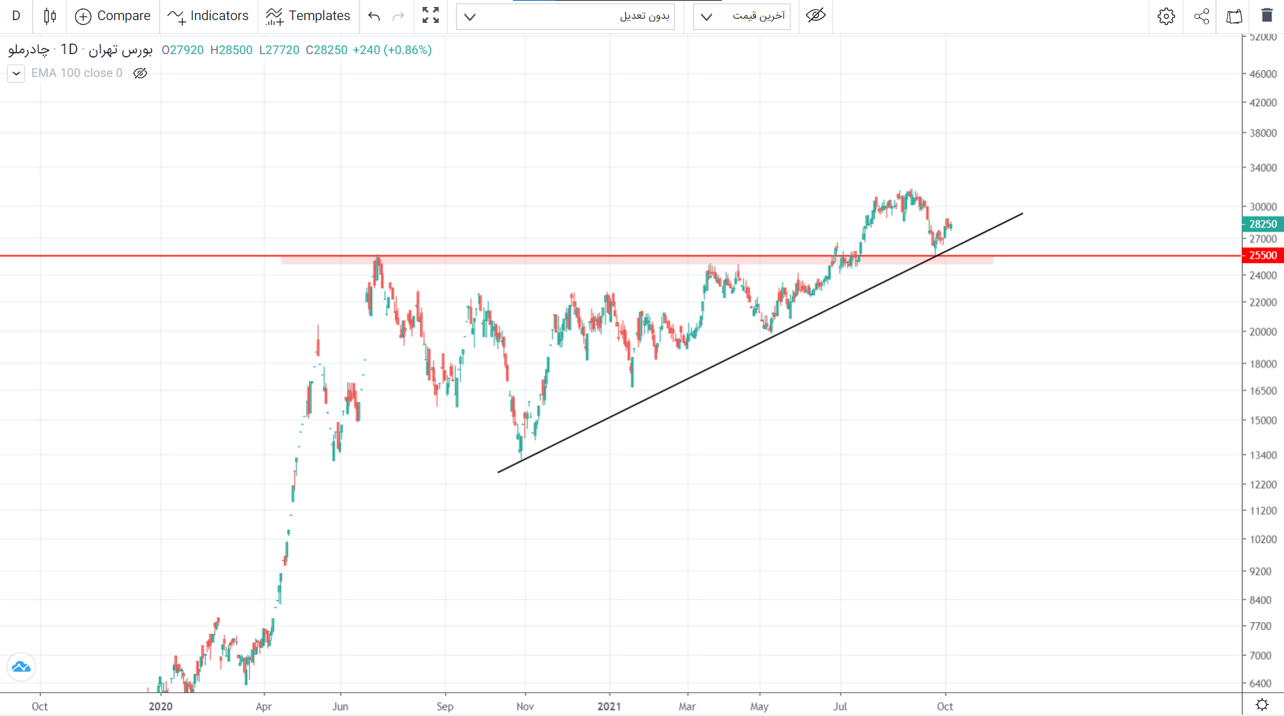 اگر نگاهی به نمودار بدون تعدیل این نماد داشته باشیم شاهد خط حمایت استاتیک و همچنین خط روند میان مدت معتبری خواهیم بود که اعتبار این ناحیه حمایتی را دو چندان میکند