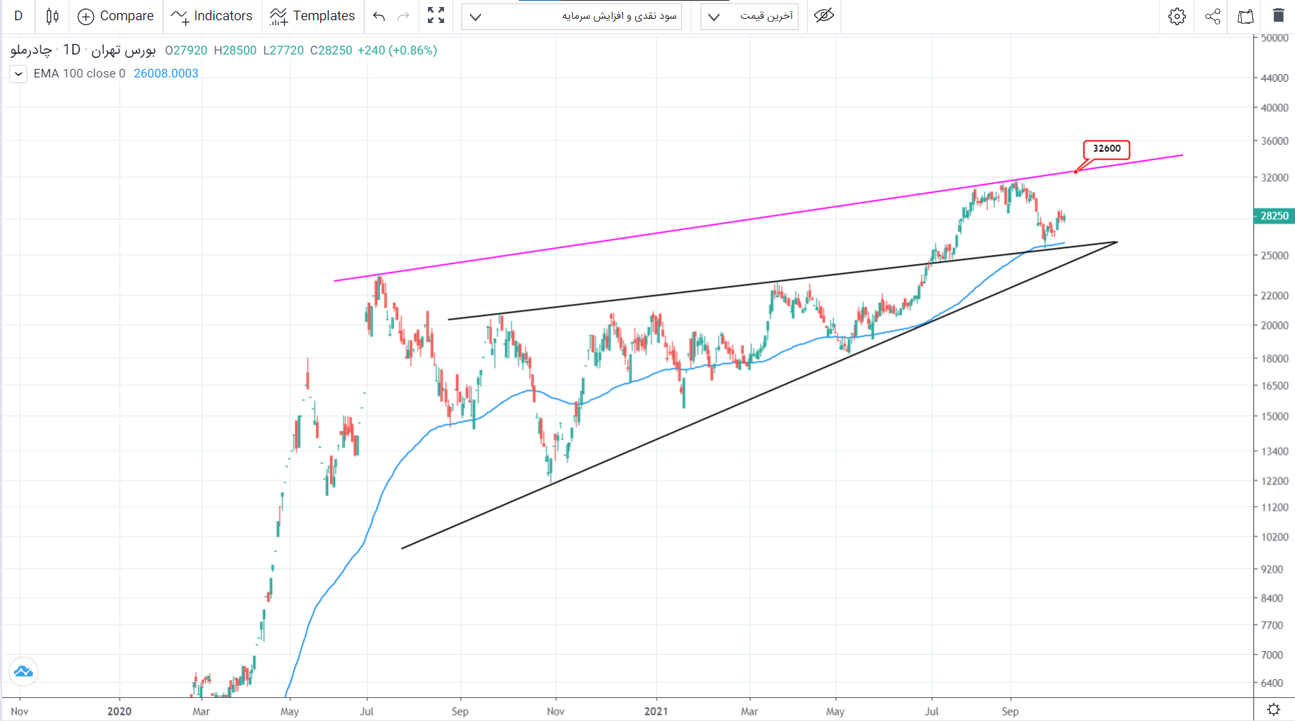 سهم پس از تشکیل الگوی مثلث مانند و شکستن این الگو مجدد به سقف مثلث برگشته و واکنش نشان داده که برابر با قیمت « 2550 » بوده همچنین نزدیک بودن این قیمت به میانگین متحرک «100روزه» به اعتبار این حمایت می افزاید