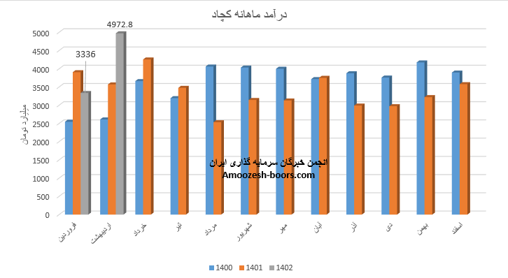نماد کچاد ( شرکت صنعتی و معدنی چادرملو ) در عملکرد تیر ماه سال 1402 درآمدی معادل 4540.5 میلیارد تومان را محقق کرده، این رقم نسبت به ماه گذشته افت 8 درصدی را تجربه نموده است ولی در مقایسه با متوسط ماهانه و مدت مشابه به ترتیب رشد 3 و 31 درصدی داشته، بخش عمده این درآمد از محل فروش کنستانتره آهن ( خشک ) به دست امده است و علت کاهش مقدار فروش داخلی فولاد نسبت به ماه گذشته که شرکت در این ماه فولاد خود را صادر نموده است، مجموع درآمد 4 ماهه سهم کچاد برابر با 17792.5 میلیارد تومان میباشد که نسبت به مدت مشابه رشد 17 درصدی داشته است.