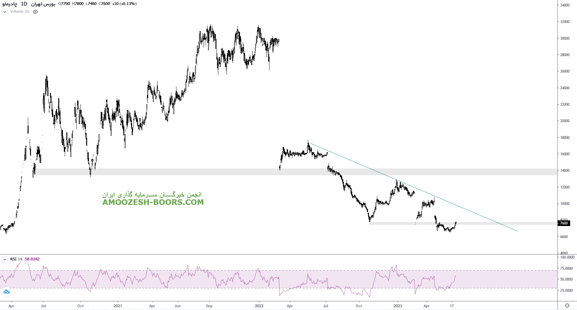 قیمت سهم کچاد بر روی مقاومت مهم ناحیه ۷۷۰ تومان قرار گرفته است. لذا در صورت شکست این ناحیه، مقاومت بعدی سهم کچاد ناحیه خط روند نزولی یعنی ۹۲۰ تومان در نظر گرفته خواهد شد که در صورت عبور از آن مقاومت بعدی کچاد ناحیه ۱۴۰۰ تومان تلقی خواهد شد. همچنین در صورت برگشت مجدد اولین حمایت سهم کچاد ناحیه 650 تومان در نظر گرفته خواهد شد.