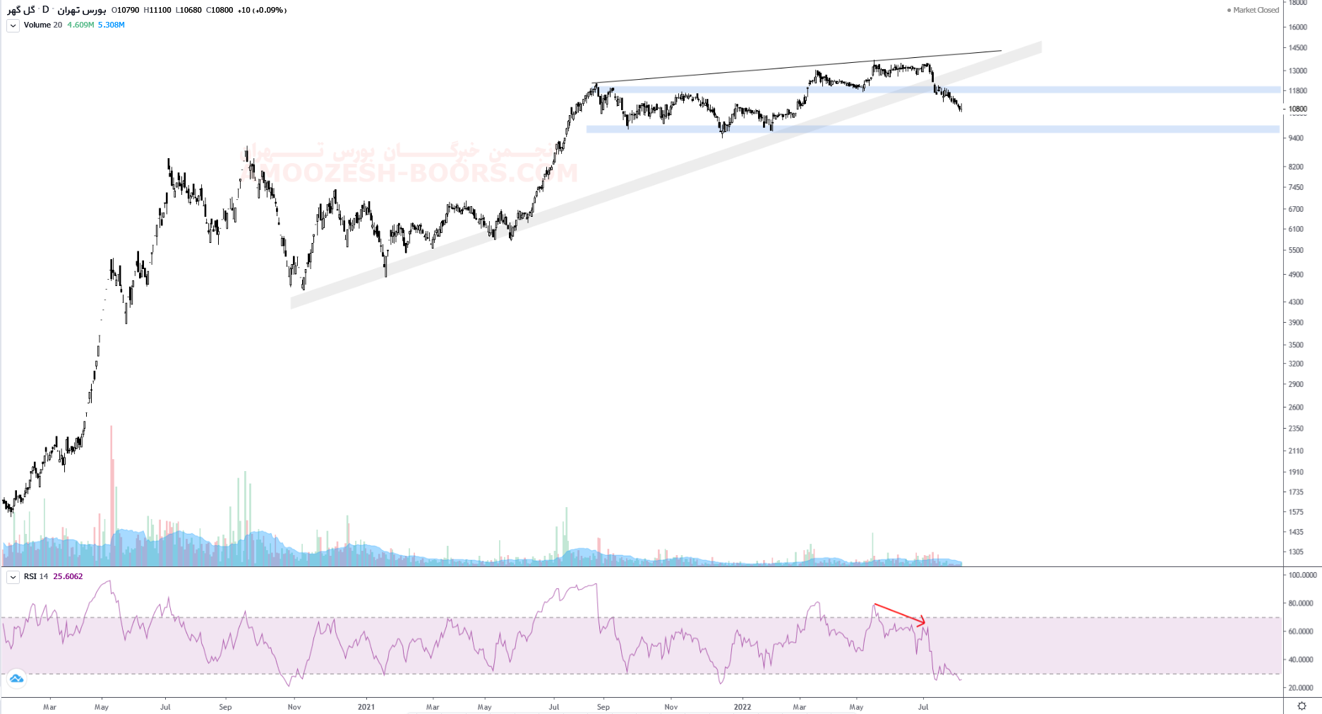 قیمت سهم کگل پس از ایجاد واگرایی منفی در اندیکاتور و کاهش قدرت خریداران با شکست خط روند صعودی خود وارد اصلاح شده و اکنون نیز ناحیه حمایتی ۹۸۰ تومان را پیش روی خود دارد که می تواند از این ناحیه حمایت شده و مجدداً رشد خود را ادامه دهد اما در صورت از دست دادن این حمایت قیمت می تواند تا ناحیه ۸۵۰ تومان نیز اصلاح خود را ادامه دهد. در صورت رشد مجدد نیز مقاومت مهم ناحیه ۱۳۰۰ تومان را پیش روی خود دارد.