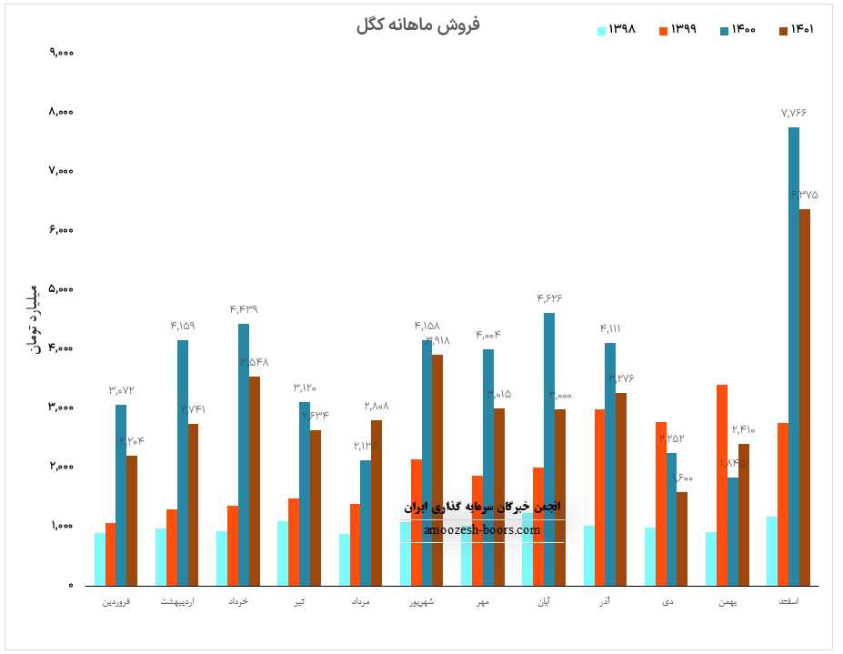 شرکت کگل (معدنی و صنعتی گل گهر) در اسفند ماه ۱۴۰1 حدود مبلغ 6375 میلیارد تومان درآمد داشته که این میزان در مقایسه با ماه گذشته 165% رشد و همچنین در مقایسه با مدت مشابه سال گذشته 18% افت پیدا کرده است.