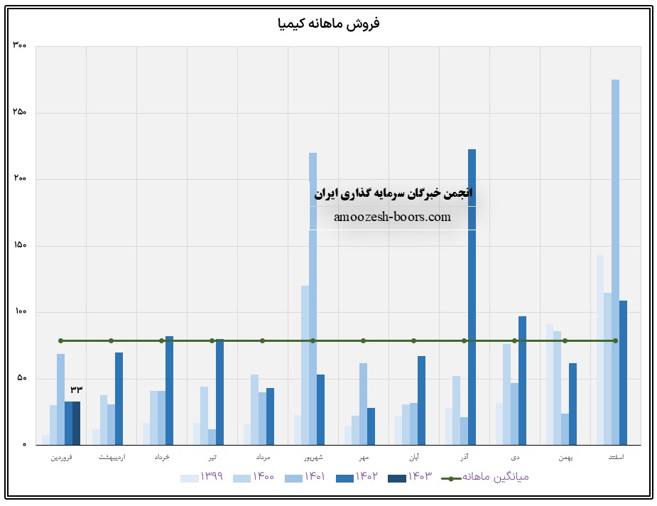 کیمیا در فروردین ماه فروش محصولی نداشته است اما از محل خدمات فلوتاسيون (شناورسازی کف یا فلوتاسیون فرآیندی برای جداسازی مواد آبگریز از آب دوست است) توانست بالغ بر 22000 تن از محل درآمد ارائه خدمات فروش داشته باشد.