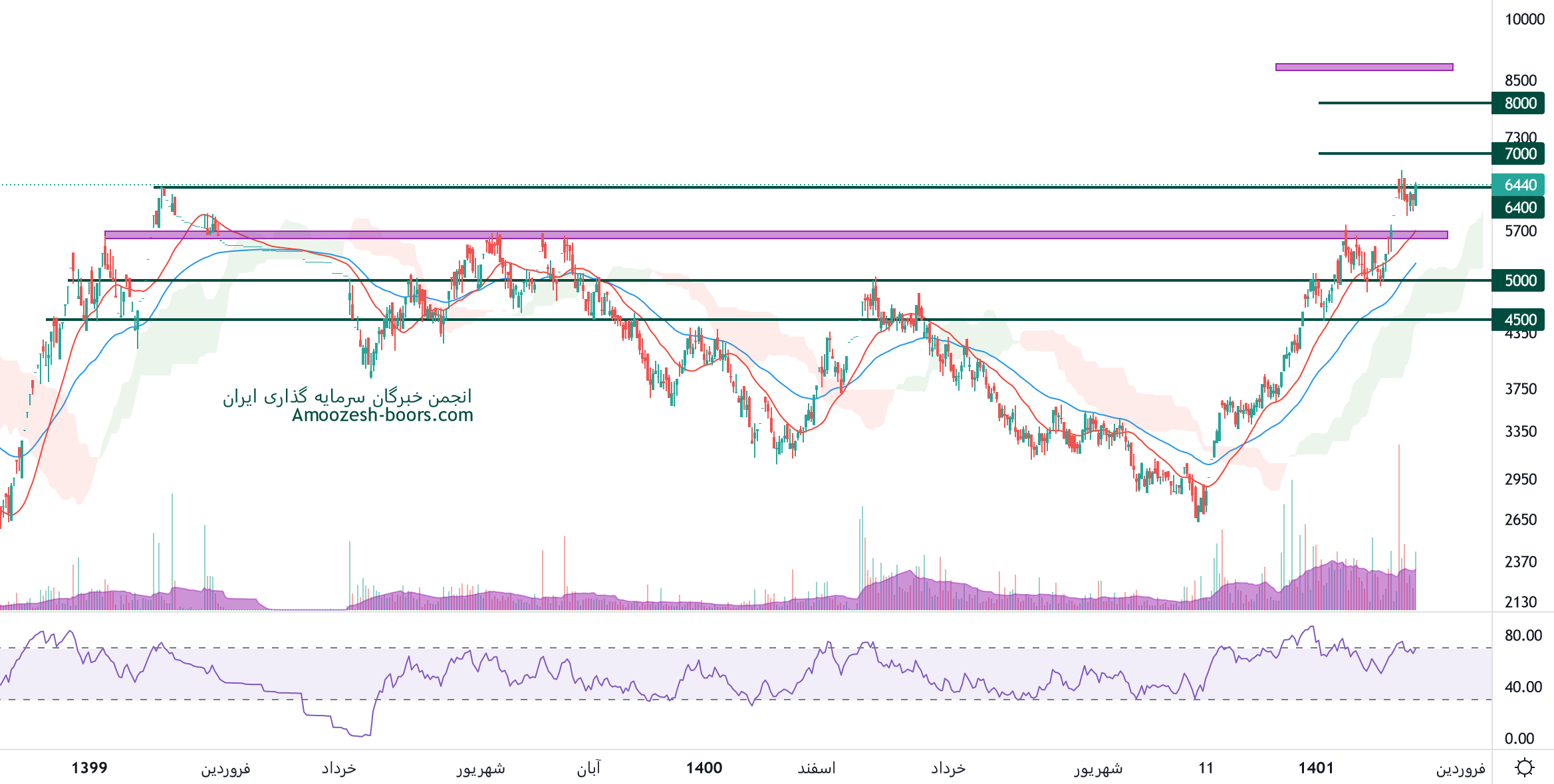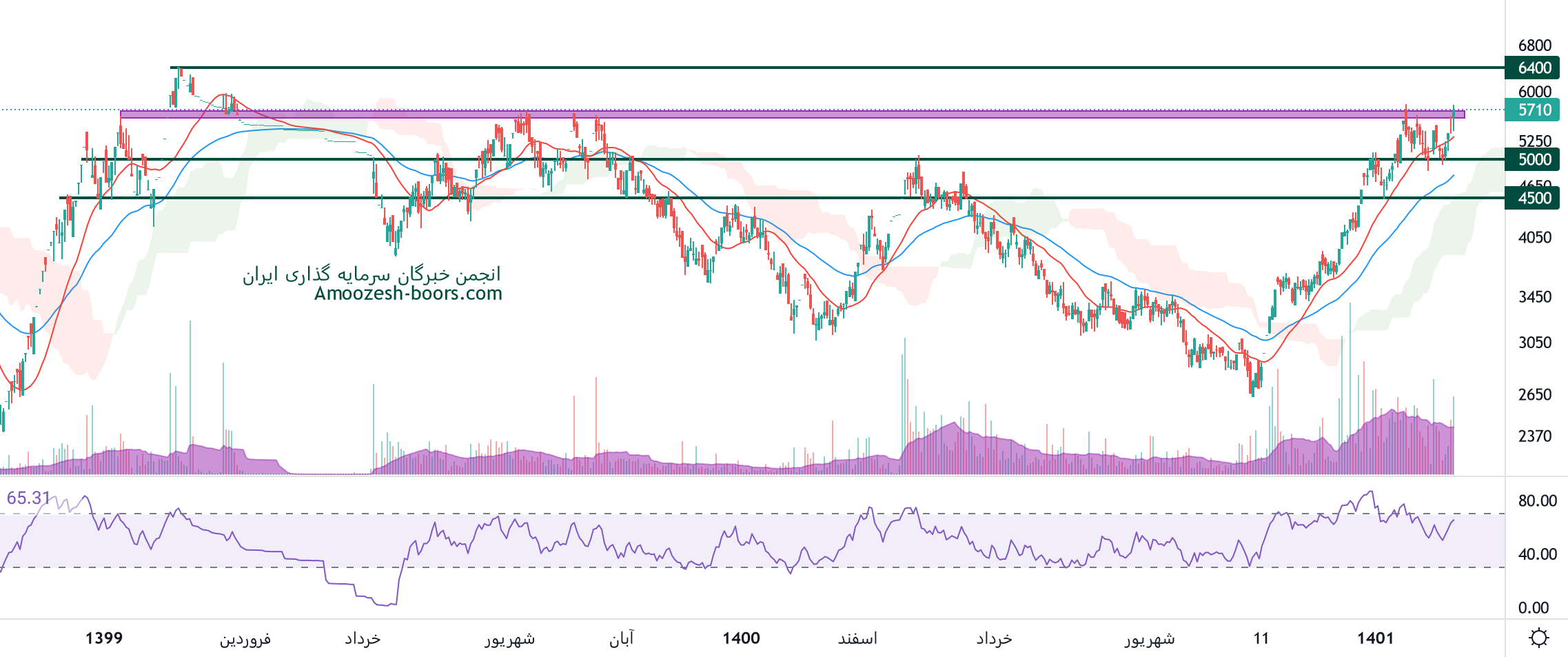 نماد کیمیا تا تست قله تاریخی خود در محدوده قیمتی 6400 ریال، مقاومت 5750 ریال را دارا میباشد، در صورت افزایش فشار فروش ورود سهم کیمیا به فاز اصلاحی، حمایت های سهم 5000 و 4500 ریال ارزیابی میگردد.