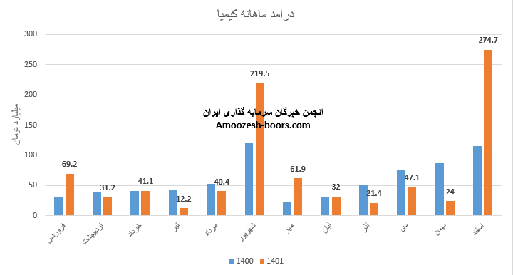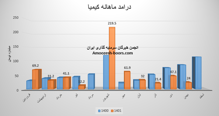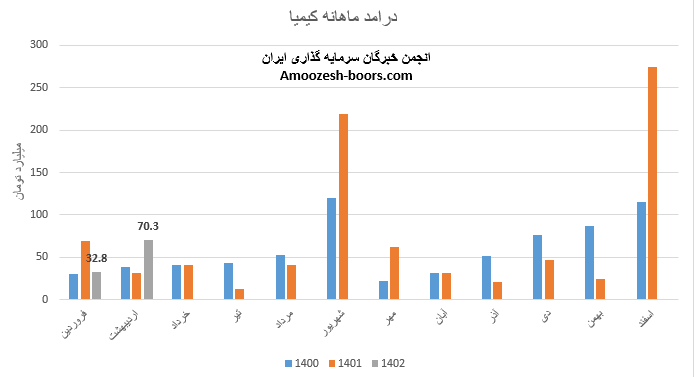 نماد کیمیا در دومین ماه از سال مالی به درآمد 70.3 میلیارد تومانی دست یافته که نسبت به ماه گذشته 114% و نسبت به مدت مشابه 125% افزایش داشته است، کنستانتره روی اکسیده که بیشترین وزن سبد فروش کیمیا را در اردیبهشت به خود اختصاص داده، افزایش مطلوب 609 درصدی مقدار فروش در مقایسه با ماه گذشته، داشته است، نرخ فروش این محصول افت 17 درصدی را تجربه نموده، مجموع عملکرد دو ماهه کیمیا نسبت به مدت مشابه رشد 3 درصدی داشته و 12% از بودجه سال قبل پوشش داده شده است.