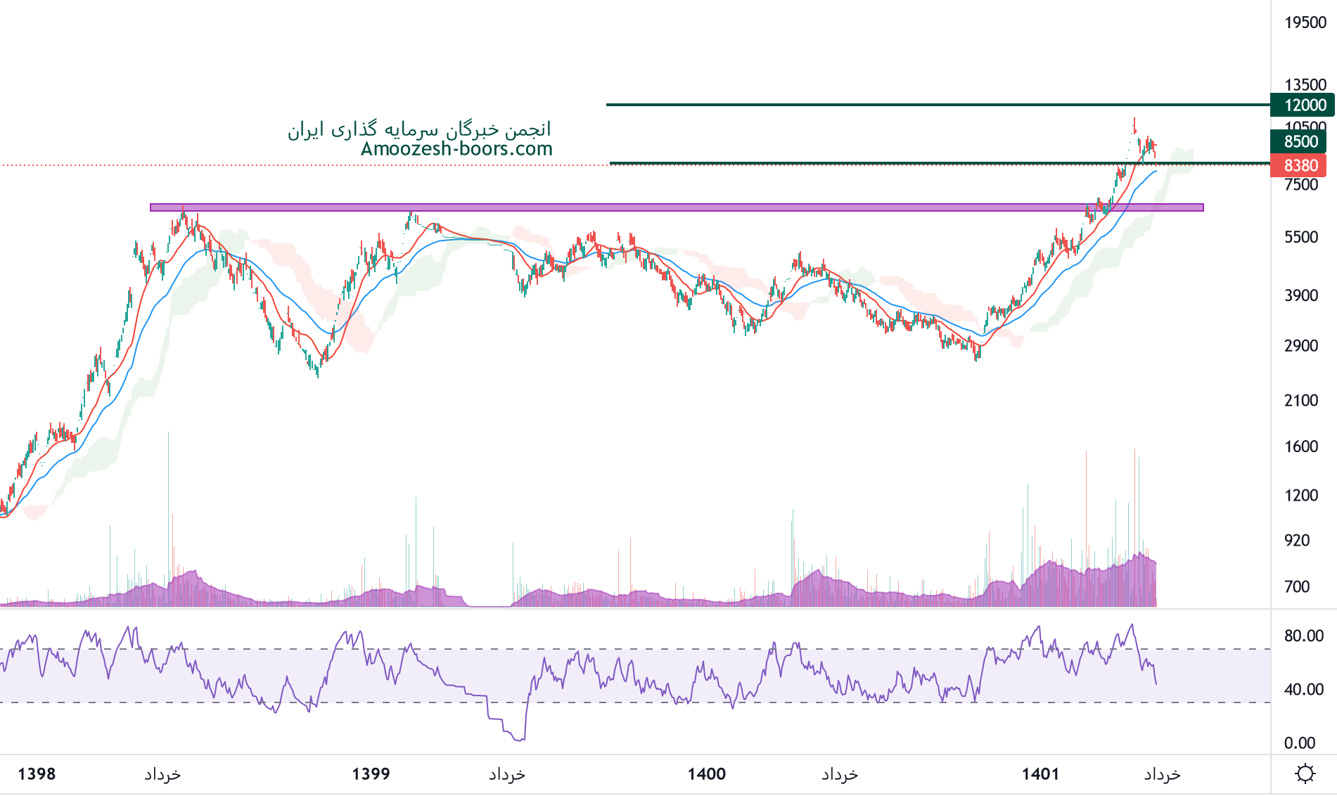 نماد کیمیا بعد از رشد شارپی که داشته به فاز اصلاحی وارد شده و در حال استراحت میباشد، مادامی که قیمت حمایت 8500 ریال را حفظ کند ریسک بالایی سهم را تهدید نخواهد کرد و تارگت کیمیا 12000 ریال در نظر گرفته خواهد شد، همچنین در صورت از دست رفتن حمایت مذکور، اصلاح قیمت سهم کیمیا تا 6500 ریال ادامه خواهد داشت.