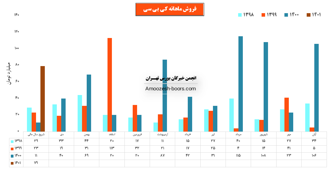 سهم کی بی سی در دی 1400 مبلغ 79 میلیارد تومان درامد داشته که این میزان نسبت به ماه گذشته 26% افت و همچنین نسبت به مدت مشابه سال گذشته 618% رشد پیدا کرده است!