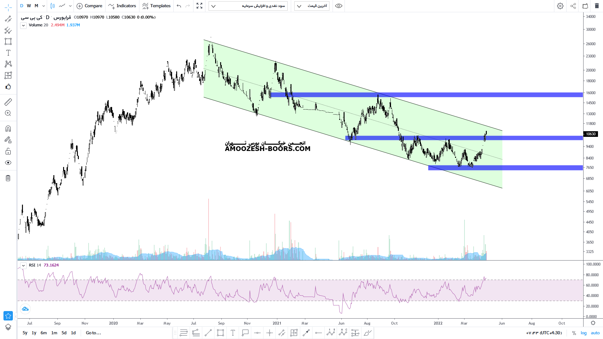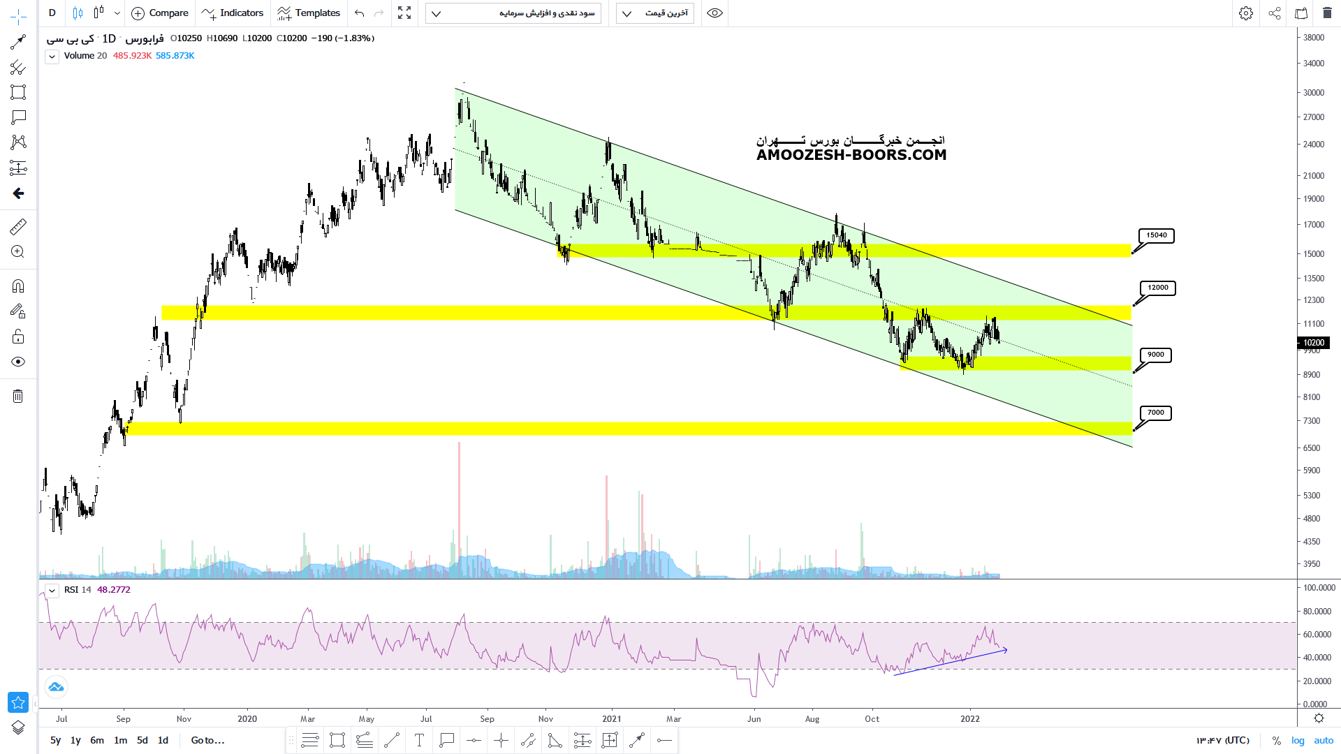 قیمت سهم کی بی سی پس از رشد از کف حمایتی مشخص شده در تحلیل قبل توانسته مقاومت مهم محدوده هزار تومان را از سر راه خود بردارد. اکنون نیز با توجه به فشردگی و نزدیکی مقاومت محدوده سقف کانال نزولی و همچنین عدم تثبیت شکست مقاومت محدوده هزار تومان هر گونه خرید و سرمایه گذاری بر روی این شرکت در این محدوده پر ریسک محسوب می شود و فعلا سیگنال صادر نمگردد. لذا در صورتی که قیمت بتوانند محدوده مقاومتی مهم ۱۰۰۰ تا ۱۲۰۰ تومان را (که هم سقف کانال نزولی دراز مدت خود و هم محدوده مقاومت داینامیکی میباشد ) از بین ببرد میتواند گزینه مناسبی برای خرید سهم کی بی سی باشد.
