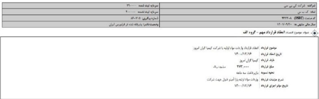همچنین سهم کی بی سی طی افشاییه ای از انعقاد قرارداد واردات مواد اولیه با شرکت کیمیا گران به مبلغ 273 میلیارد ریال خبر داد .